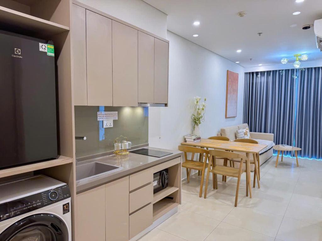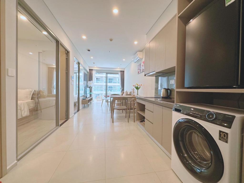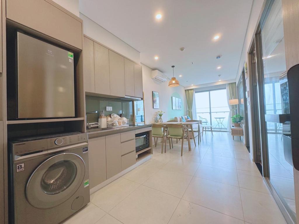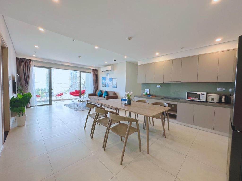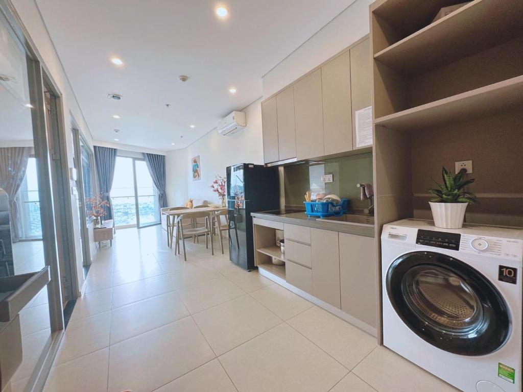 The apartment at The Song Apartment 28 Thi Sach, Vung Tau is wonderful, with a sea view, right next to the beach. You just have to cross the street to reach the beautiful swimming area with fine sand, a gentle sandy beach, and waves crashing in sequence, making it very suitable and quite safe for small children accompanying their families. The location offers convenient transportation and various dining spots, just over 100m from LOTTE MARK shopping center, and only 2km from the seafood market in Xom Luoi, where there are many types of fresh seafood at very reasonable prices. After buying the goods, you can hire someone to prepare the dishes on-site for prices ranging from 30,000 to 50,000 VND/kg. The beach is still under development, so there are many beautiful landscapes, such as the walking bridge for catching the sunrise over the sea, which connects the beach with the shopping center within the Imperia building. From the bridge, visitors can enjoy watching the traffic below on the street. The atmosphere here is fantastic. Just a note: due to the high number of guests using the elevator, you may sometimes have to wait for 15-20 minutes for the elevator.